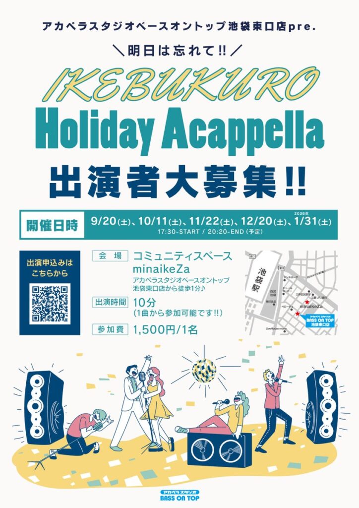 アカペラスタジオベースオントップ池袋東口店より徒歩1分‼️『minaikeZa』様にて開催いたします🎙️学生も社会人も明日は忘れて盛り上がっていきましょう‼️