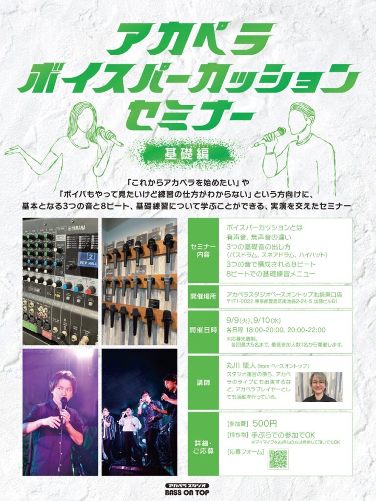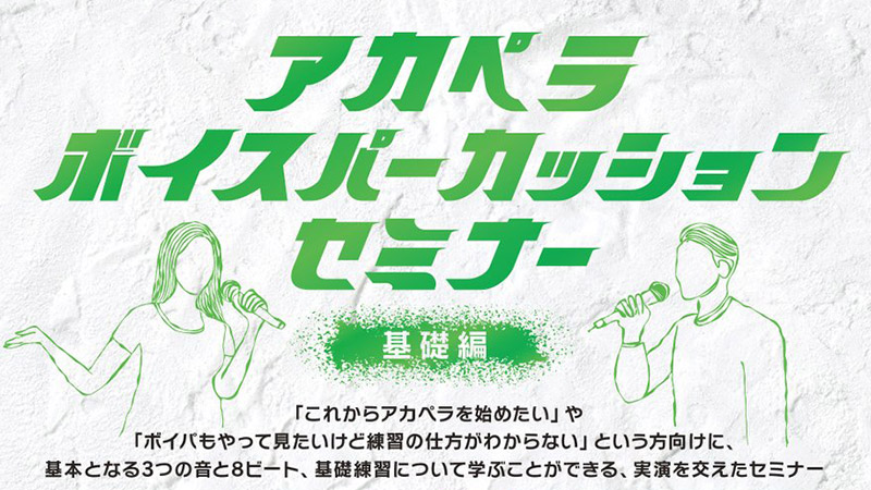 池袋東口店スタッフ丸川による、「これからアカペラを始めたい」や「ボイパもやって見たいけど練習の仕方がわからない」という方向けに、基本となる3つの音と8ビート、基礎練習について学ぶことができる、実演を交えたセミナー