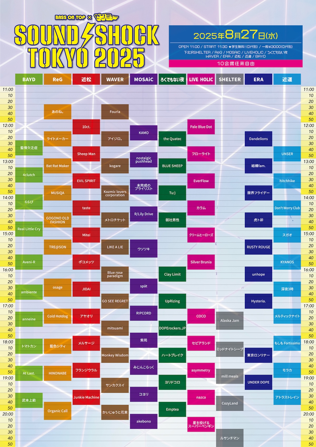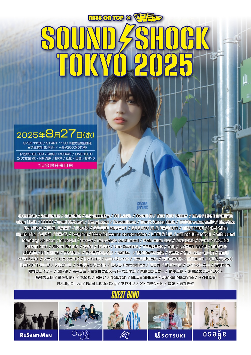 SOUND SHOCK TOKYOが今年も開催決定。2025年8月27日に下北沢各会場にてSOUND SHOCK TOKYO2025を開催いたします。昨年からさらに2会場追加し下北沢SHELTER/ReG/MOSAiC/LIVEHOLIC/ろくでもない夜/WAVER/ERA/近松/近道/BAYD(※10会場往来自由)の10会場開催。