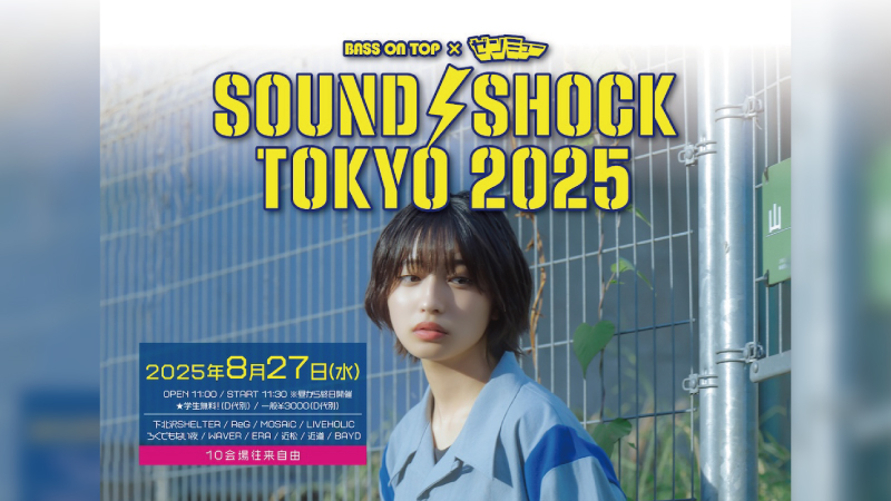 SOUND SHOCK TOKYOが今年も開催決定。2025年8月27日に下北沢各会場にてSOUND SHOCK TOKYO2025を開催いたします。昨年からさらに2会場追加し下北沢SHELTER/ReG/MOSAiC/LIVEHOLIC/ろくでもない夜/WAVER/ERA/近松/近道/BAYD(※10会場往来自由)の10会場開催。