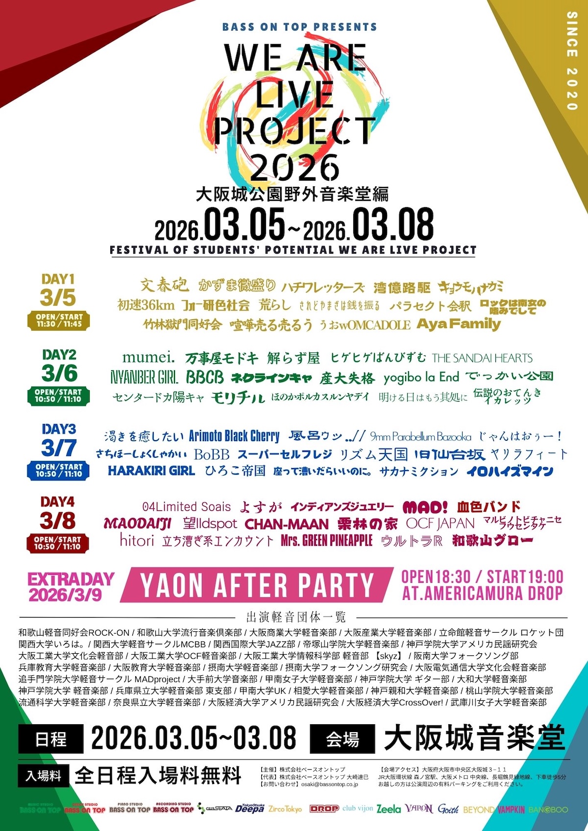 ベースオントップが主催する関西全域の軽音団体、サークルを対象としたジョイントライブイベントです。様々な軽音団体が大学の垣根をこえて交流する場所としてWe are Live projectはライブハウスでこれまで約50回開催しております。Special Editionとして毎年3月に野外音楽堂で開催しております。昨年は37団体の軽音団体が出演致しました。